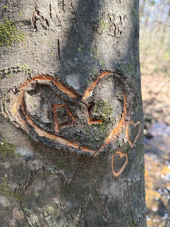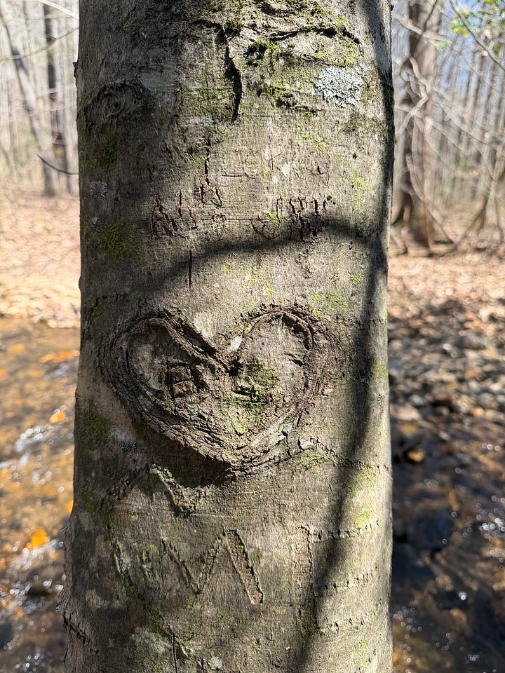 + While on our trip last week, Levi and I found the tree where we had carved our initials inside a heart. Nearly 20 years ago! This time, we added two hearts.
